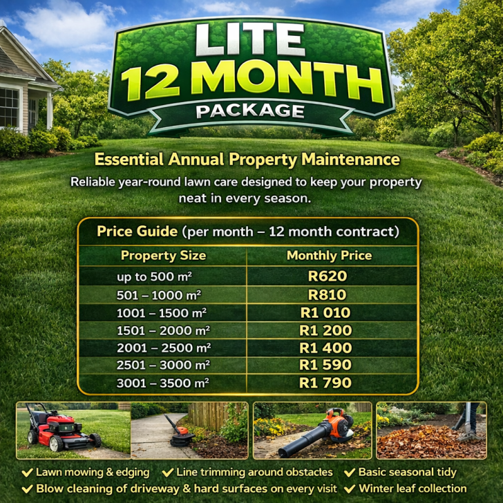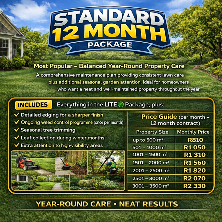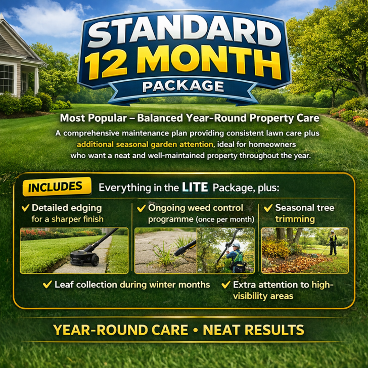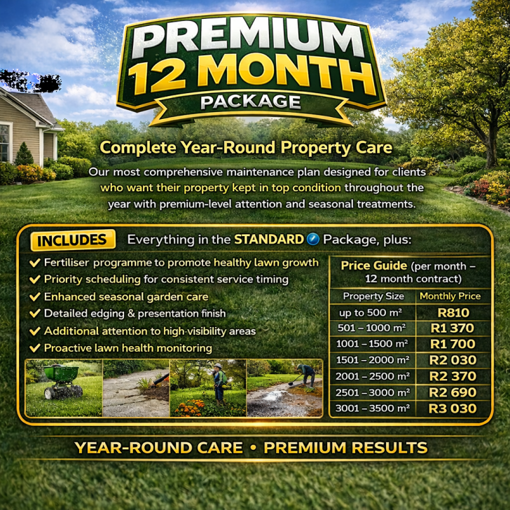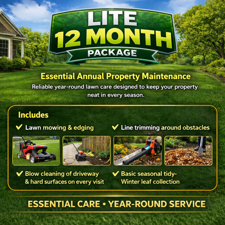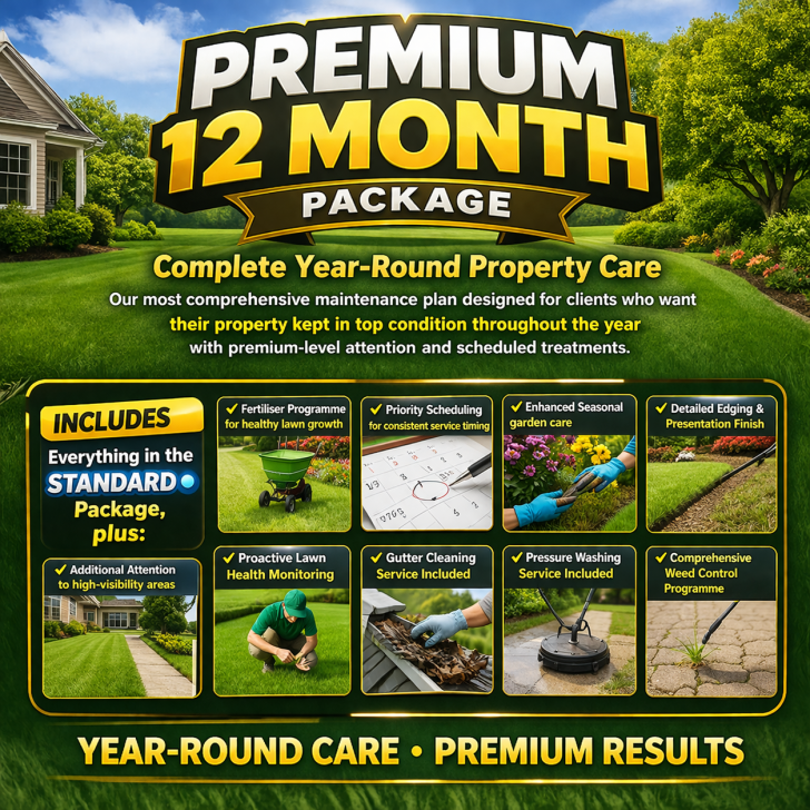 Keep your property neat, healthy and professionally maintained throughout the entire year. Our 12 Month Property Care Packages ensure your lawn and garden always look their best in every season.